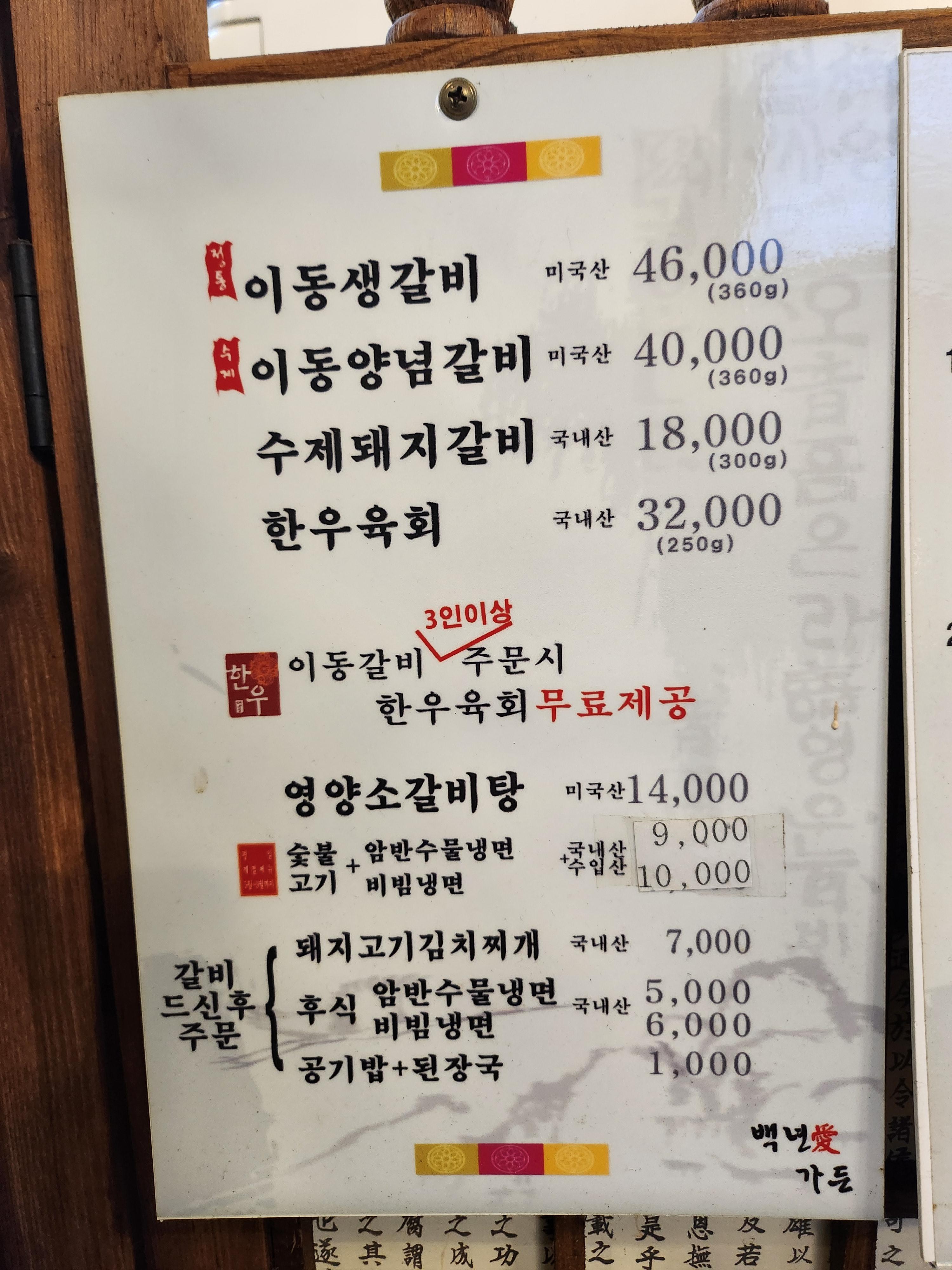 • 이동생갈비 또는 이동양념갈비 3인분 이상 주문 시 → 한우육회 무료 제공