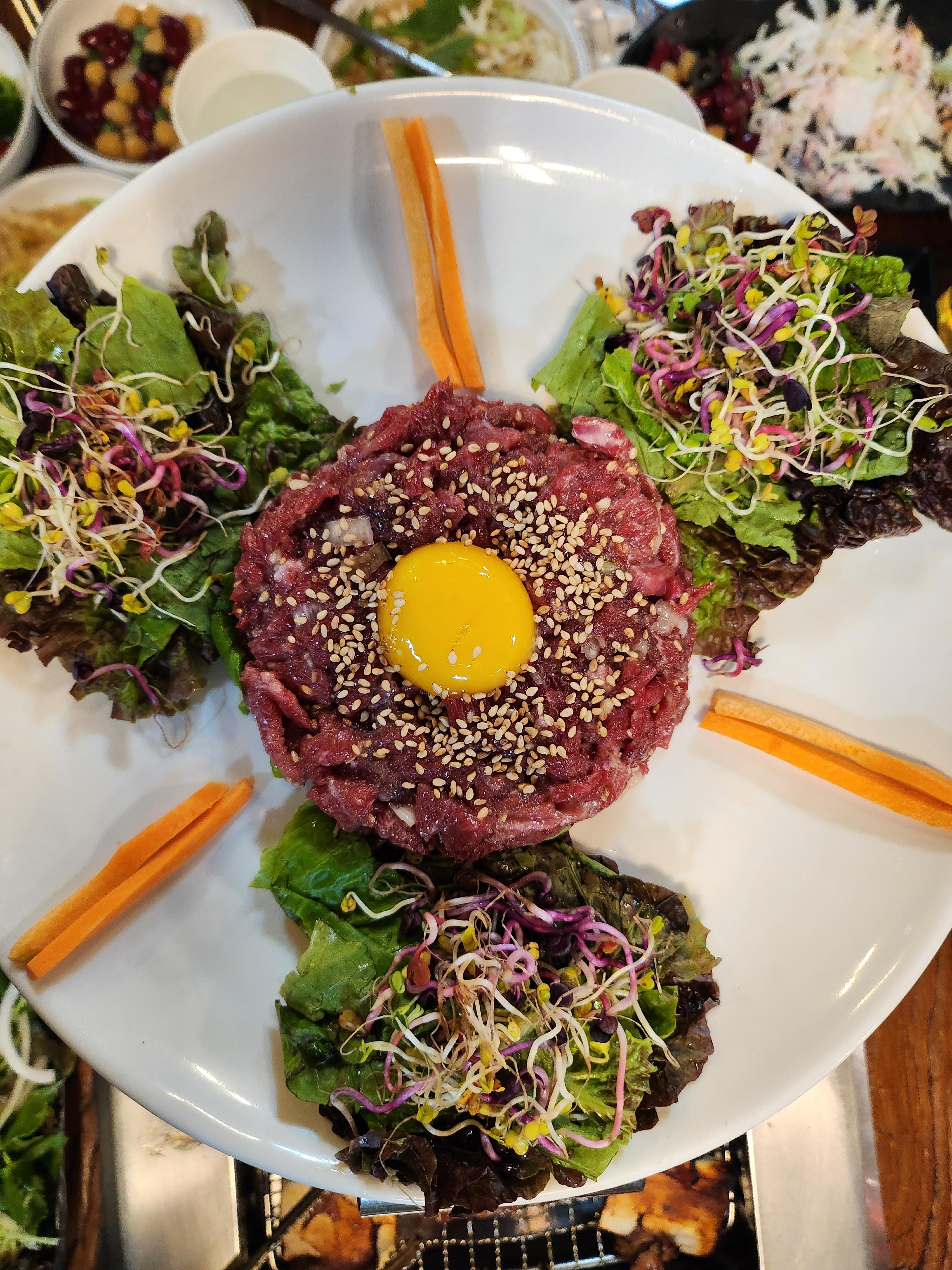 이동갈비 3인 시키면 나오는 육회 서비스                                                                암반수 물 냉면
